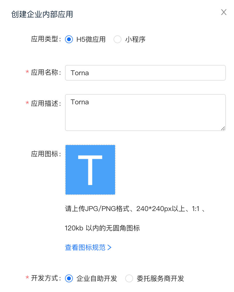 进入应用开发 - 企业内部开发,点击创建应用,创建一个创建企业内部应用,填写表单