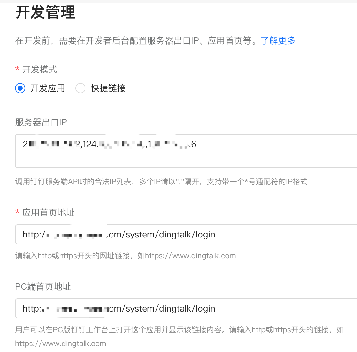 填:http://{domain}/system/dingtalk/callback,domain为你的公网域名